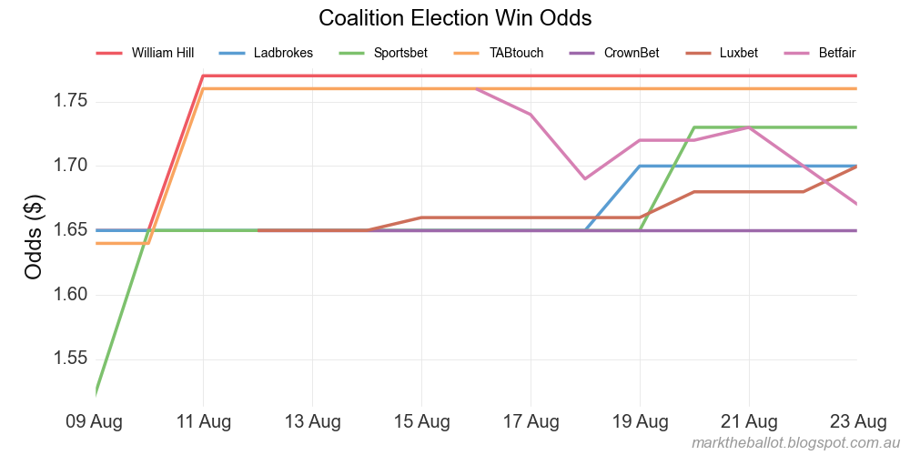 TABtouch has adjusted its odds from $1.64/$2.25 to $1.76/$2.04. That is a move from a 57.7 per cent probability of a Coalition win at the next election to a 53.4 per cent probability.