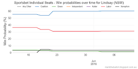 On some days, the odds for a particular seat are missing. On those days, I plot the last known odds to ensure my tally of seat favourites comes to 150 seats. Today, for example, there were no odds for Lingiari (NT) and Murray (VIC). A table of missing odds by date follows.