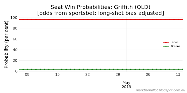 This looks like a small movement to the Coalition. Labor's probability of winning majority government has slipped from 99.5 per cent (when I last ran this) to 99.0 per cent. The Coalition has no chance of winning majority government according to the punters.