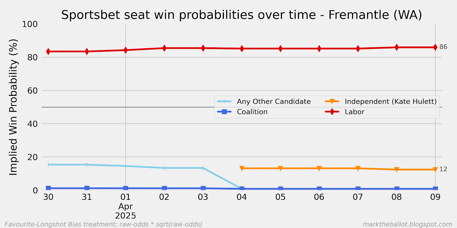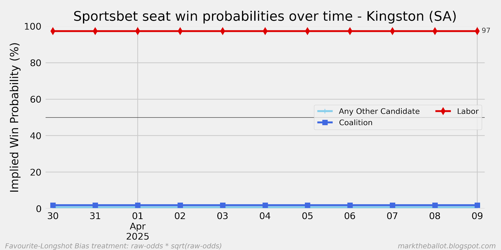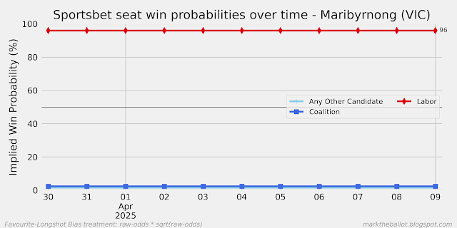 Today, let's look the complete set of charts from the individual seats market. Overall, we can see another net seat with Labor in the lead. The two seats that were tied yesterday (McEwan and Robertson) have bounced to a Labor lead.