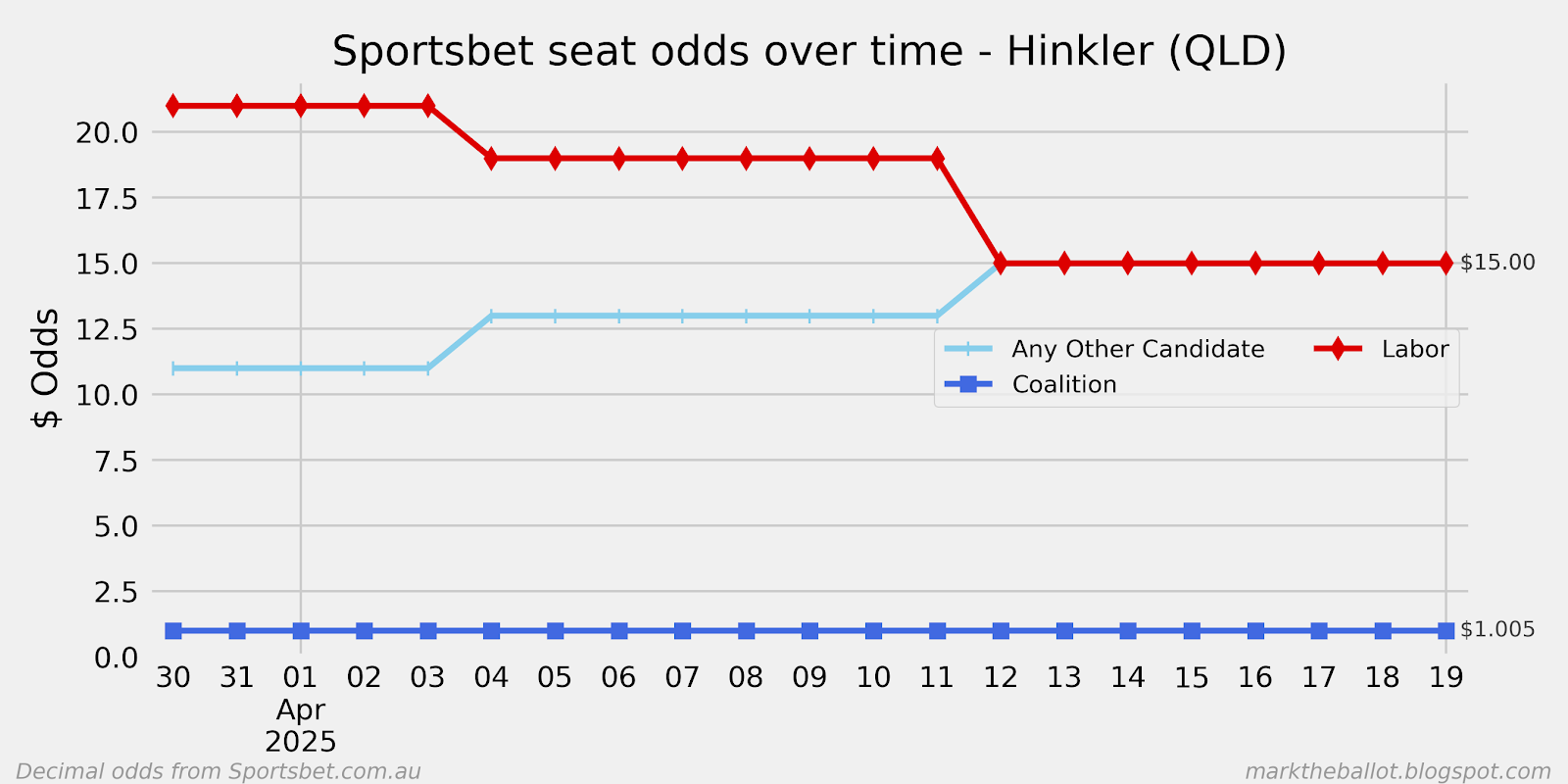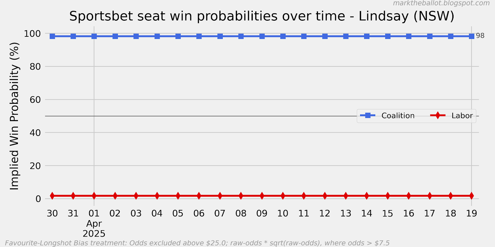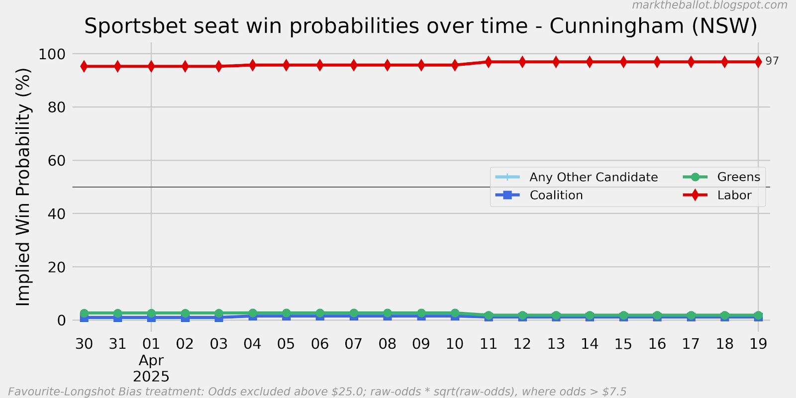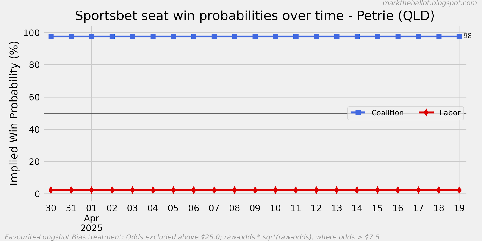 I have been refining my code for the individual seats market at Sportsbet.com.au. Before we get to the charts for every seat, let me take you through the changes I have made.