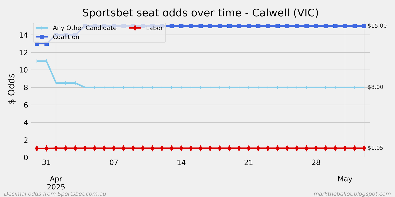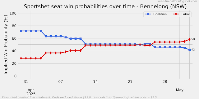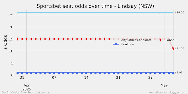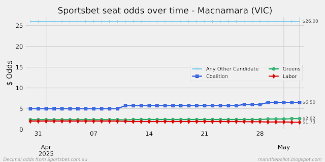 At 6.30am this morning, the betting market at Sportsbet was firmly of the view that the Labor Party will provide the Prime Minister in the new Parliament. The odds for a Coalition win were \$9.30 (down from \$11.00 yesterday). The odds for a Labor win were \$1.08 (up from \$1.06 yesterday). The probability of a Labor win was 89.6 per cent - down from 91.2 per cent yesterday.